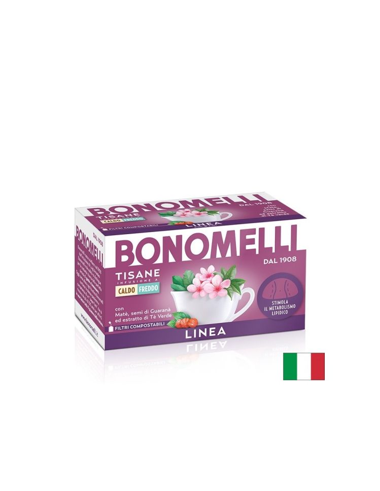 Tisane Linea на италианската компания Bonomelli е висококачествена билкова смес, която съдържа в състава си екстракт от зелен чай, гуарана, мате, хибискус, лайка и концентриран сок от праскова. Има приятен вкус и допринася за подобряване на обмяната на веществата и увеличаване на забавения метаболизъм. В комбинация с балансиран хранителен режим и физическа активност спомага за редуциране на телесните мазнини. Насърчава отслабването по естествен път и допринася за контрола на телесното тегло. Спомага за намаляване на повишения апетит, особено към сладки храни и въглехидрати, осигурява антиоксидантна защита на клетките на тялото, има диуретично действие и допринася за пречистването на организма от токсини и вредни вещества. Този билков чай действа тонизиращо и ободряващо и допринася за повишаване на концентрацията и фокуса.