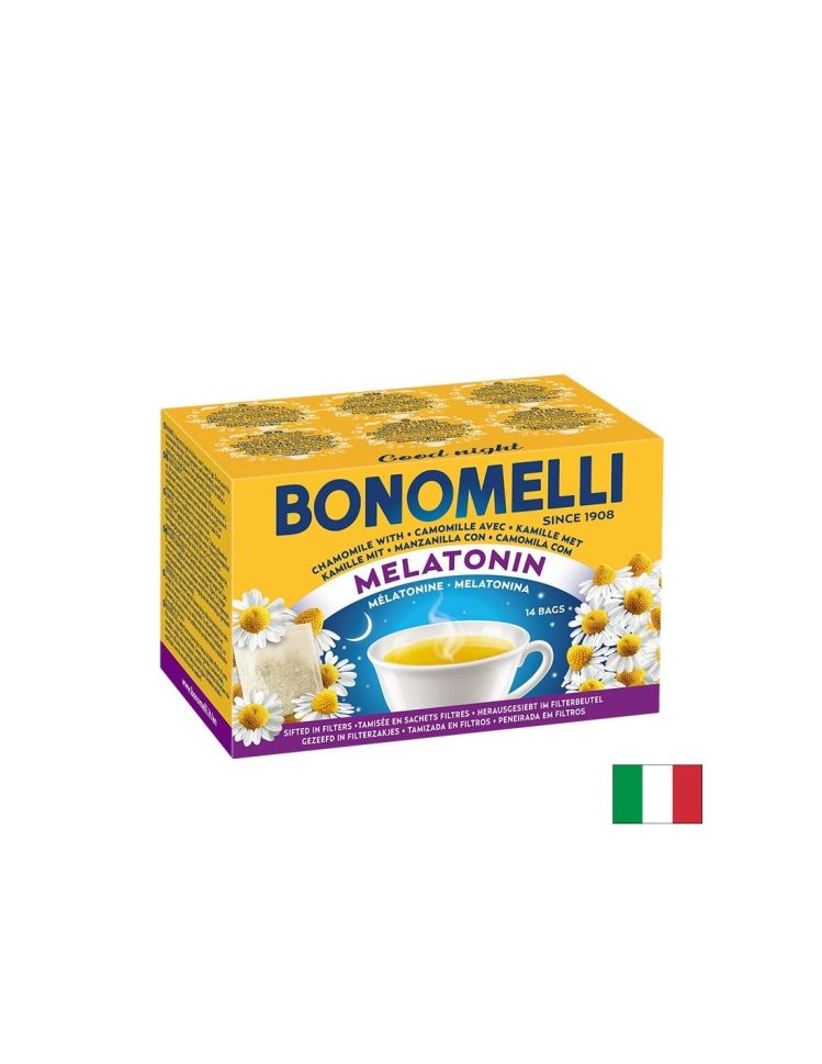 Билковият чай на Bonomelli съдържа екстракт от цвят на лайка, в комбинация с мелатонин и магнезий, действа успокояващо, редуцира стреса и улеснява заспиването
