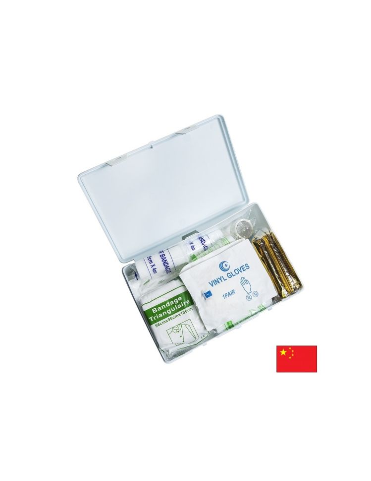 Кутията за първа помощ съдържа основни средства за грижа за рани – стерилни марли с различни размер, бинтове и тиксо за прикрепяне, както и специализирани артикули с приложение при изгаряния, фрактури и други наранявания. Виниловите ръкавици са за защита, както на помагащия, така и на пострадалия. Ръкавиците осигуряват бариера срещу замърсяването на наранения участък от страна на обработващия раната, когато липсва дезинфектант. В комплекта е включена ножица за отрязване на необходимата дължина от бинта, а също и за отстраняване на част от дрехата на ранения, ако това се налага.