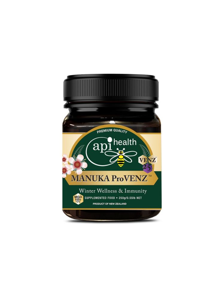 Manuka Pro VENZ на ApiHealth е иновативен пчелен продукт, като комбинира три активни съставки с естествен произход – многоцветен мед от манука с гарантирано съдържание на MGO 100+, пчелна отрова VENZ™ и новозеландски прополис. Продуктът е разработен по собствена патентована технология, базирана на научни и клинични данни за ефективността на всяка от съставките.