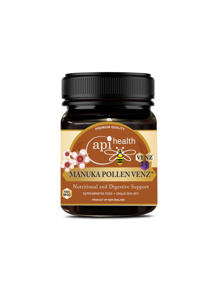 Manuka PollenVENZ на новозеландската компания ApiHealth е натурален подсилен пчелен мед, съчетаващ силата на три уникални пчелни компонента – многоцветен мед от манука с гарантирано съдържание на MGO100+ , пречистена пчелна отрова и пчелен прашец. Разработен за подкрепа на имунната система, ставите, храносмилането и физическата активност.