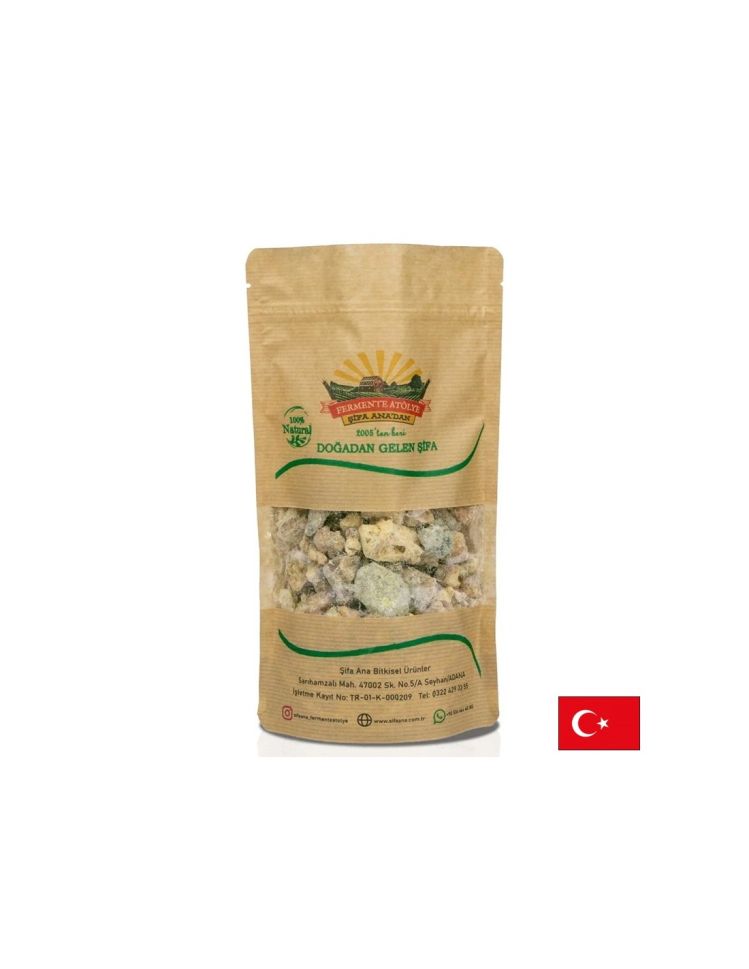 100% натурална смола, събрана от кедрови и смърчови дървета. Използва се вътрешно за освежаване на дъха и подкрепа на гърлото, а външно – за успокояване на раздразнена кожа, напукани участъци и леки кожни неразположения