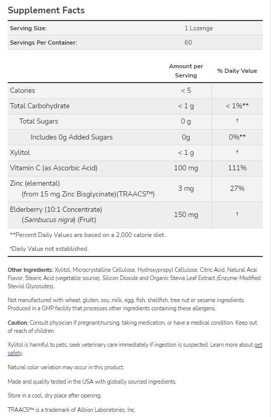 NOW Foods Sambucus Zinc-C | Immune Support [60 Подезични таблетки , 60 Дози]