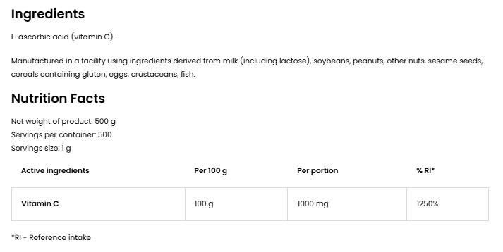 OstroVit 100% Vitamin C Powder [500 грама, 500 Дози]