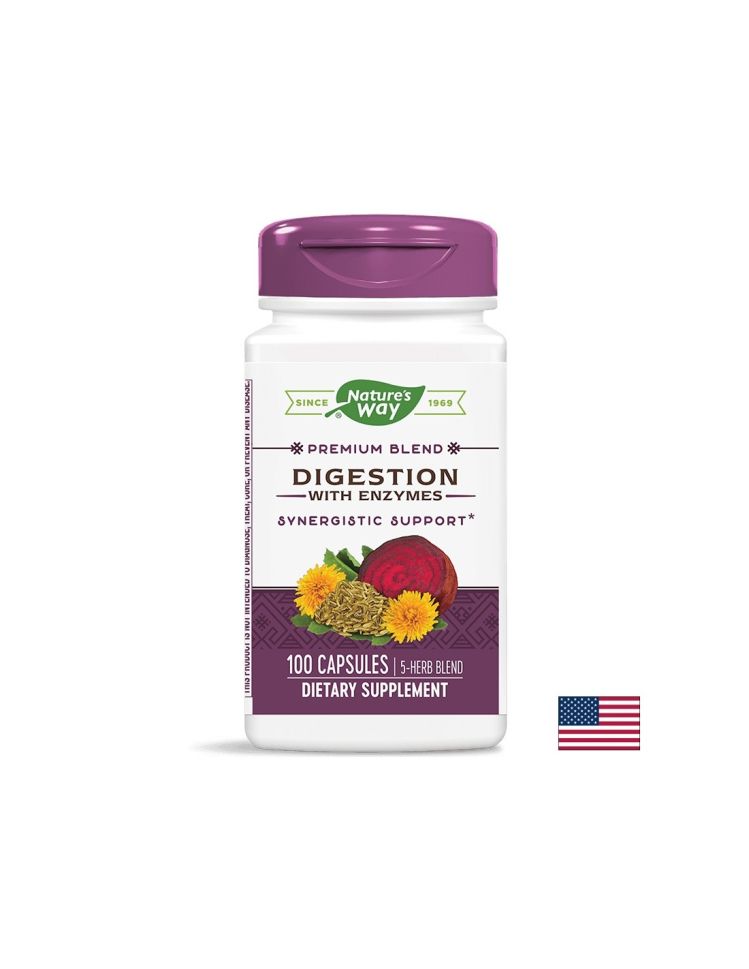 Формулата Digestion with Enzymes на Nature’s Way съдържа смес от ензими и билки за подпомагане на храносмилането. Съдържа глухарче, което помага за лечение на чернодробни заболявания и притежава леко слабително действие, облекчава някои от симптомите при лошо храносмилане, включително запек, подуване на корема, придружено с болка и дискомфорт, прекомерно образуване на газове, киселини след хранене, и др. Храносмилателните ензими спомагат за разграждането и оптималното усвояване на храните.