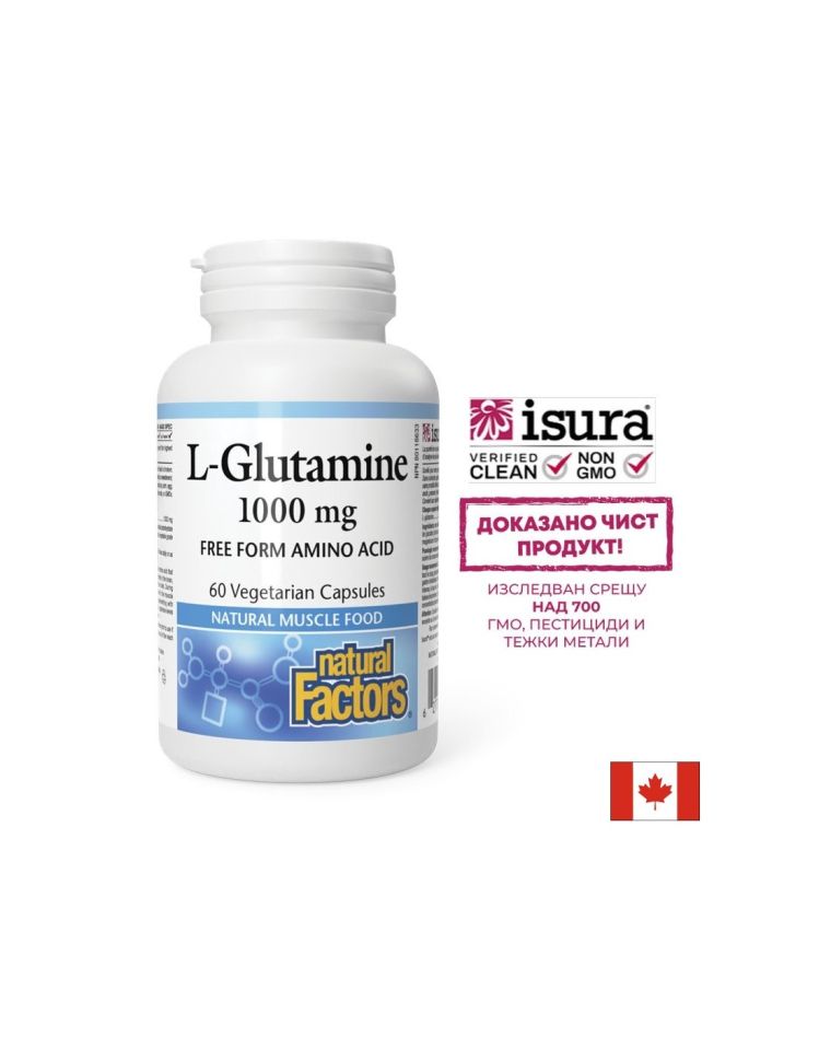 Л-Глутамин на канадската компания Natural Factors e аминокиселина с натурален произход спомагаща за поддържане на оптималното състояние на мускулите и енергийния метаболизъм.
