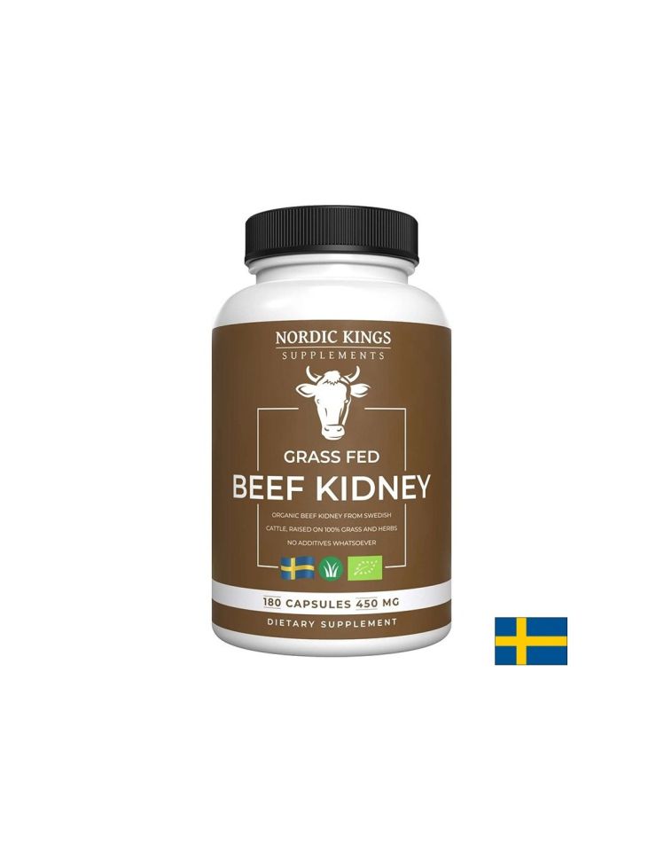 Beef Kindey (grass fed) - Телешки бъбрек е 100% органична хранителна добавка под формата на капсули, добита от бъбреците на KRAV сертифицирани телета, хранени изцяло с трева и билки. Не съдържа в състава си антибиотици, пестициди и хормони на растежа, а телешките бъбреци са изсушени чрез замразяване като този начин се запазват всички ценни хранителни вещества. Тази хранителна добавка е богата на витамини, минерали и ценни ензими, включително витамин C, E, A, желязо, калций, калий, йод и фосфор. Допринася за нормалното състояние на бъбреците, стимулира имунитета и подобрява работата на щитовидната жлеза. Благодарение на високото съдържание на антиоксидантни, телешкият бъбрек спомага за отвеждане на натрупалите се токсини от тялото и защитава клетките от оксидативен стрес. Подобрява работата на червата и стомаха и оказва положителен ефект върху функциите на нервната система.