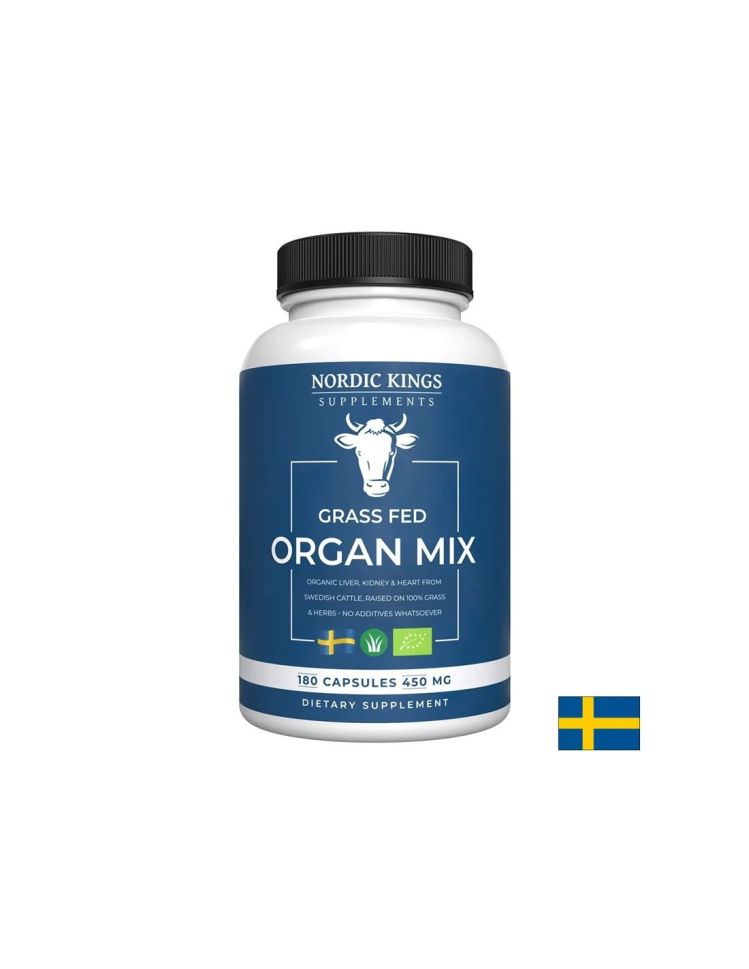 Organ Mix (grass fed) - Телешки черен дроб, бъбрек и сърце е напълно органична хранителна добавка под формата на капсули, добита от черен дроб, бъбрек и сърца от хранени изцяло с трева и билки KRAV сертифицирани телета. Не съдържа в състава си пестициди, антибиотици или хормони. Тази смес е внимателно изсушена чрез замразяване, за да се запазят всички полезни хранителни вещества. Тя съдържа в състава си разнообразие от ценни витамини и минерали като витамини от групата B, цинк, желязо и селен, както и мощният антиоксидант коензим Q10. Тази хранителна добавка спомага за поддържането на нормален енергиен метаболизъм както и за нормалното образуване на червени кръвни клетки. Укрепва имунната система и общото добро състояние. Освен това допринася за поддържането на оптимални нива на хемоглобин в кръвта и се грижи за здравето на сърцето, сърдечно-съдовата и нервната система. Благодарение на антиоксиданта коензим Q10, тази смес спомага за елиминирането на натрупалите се в тялото токсини и ускорява синтеза на колаген в тялото.