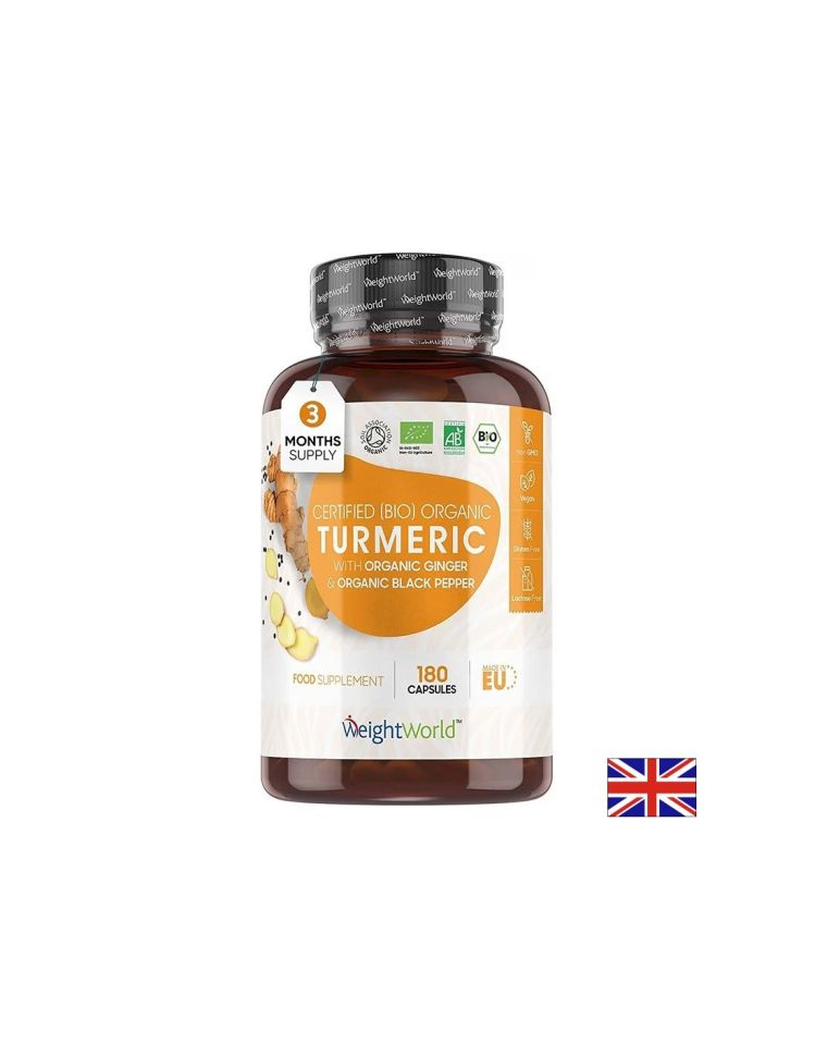 Оганичната куркума WeightWorld™ с черен пипер и джинджифил на капсули е натурален продукт за подобряване състоянието на сърдечно-съдовата система, ставите и опорно-двигателния апарат. Висококачествената куркума осигурява мощна имунна подкрепа. Пиперинът от черния пипер допринася за увеличаване на бионаличността ѝ, като гарантира усвояването на максимума от активните съставки. Капсулите са без ГМО. Съдържат мощна порция от 1520 mg куркума, която се грижи за тялото по естествен начин. Това е единствена по рода си формула за жизненост и здраве.