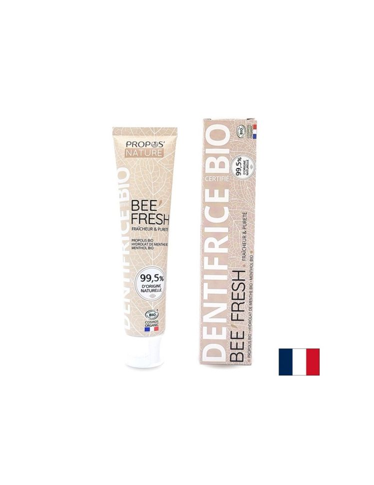 Dentifrice Bee Fresh Bio / Паста за зъби с Прополис, 75 ml е продукт на Propos’Nature, Франция. Формулата на пастата за зъби включва вода от листа на мента /Mentha Piperita/,  глицерин, прополис, ментол и други. 99,55% от съставките са с натурален произход, а 33,92% от тях са произведени по методите на биологичното земеделие.