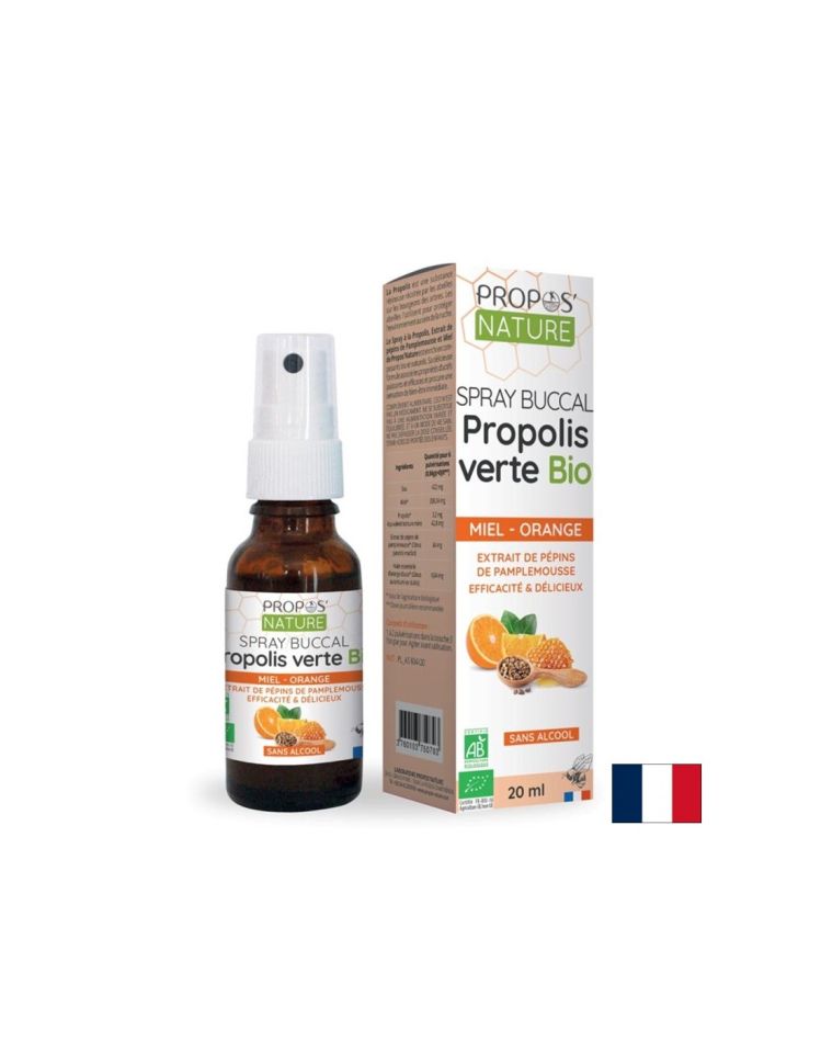 Spray Buccal Propolis Verte & Extrait De Pépins de Pamplemousse Bio, Miel & Orange / Спрей за гърло с екстракт от прополис, грейпфрут (семена), пчелен мед и портокал, 20 ml е хранителна добавка на френската компания Propos’Nature. Формулата включва прополис, екстракт от семена на Грейпфрут, Витамин C, пчелен мед и етерично масло от сладък портокал /Citrus aurantium dulcis/. Продуктът допринася за нормалното състояния на горните дихателни пътища и гърлото.
