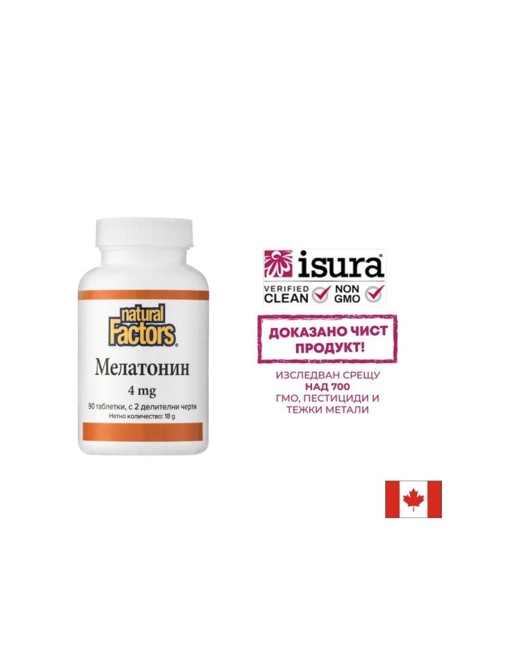 Мелатонин на канадската марка Natural Factors е изцяло натурален продукт без съдържанието на каквито и да е синтетични вещества, допринасящ за по-добър и качествен сън. Произведен е по нова патентована технология и рядко води до каквито и да е странични ефекти. Действа на принципа на натрупване в дългосрочен план и не води до привикване. Спомага за преодоляването на безсънието и влошеното качество на сън, като значително ускорява времето за заспиване и намалява честите събуждания през нощта. Притежава известен редуциращ нивата на стреса ефект и подпомага общото психично здраве.