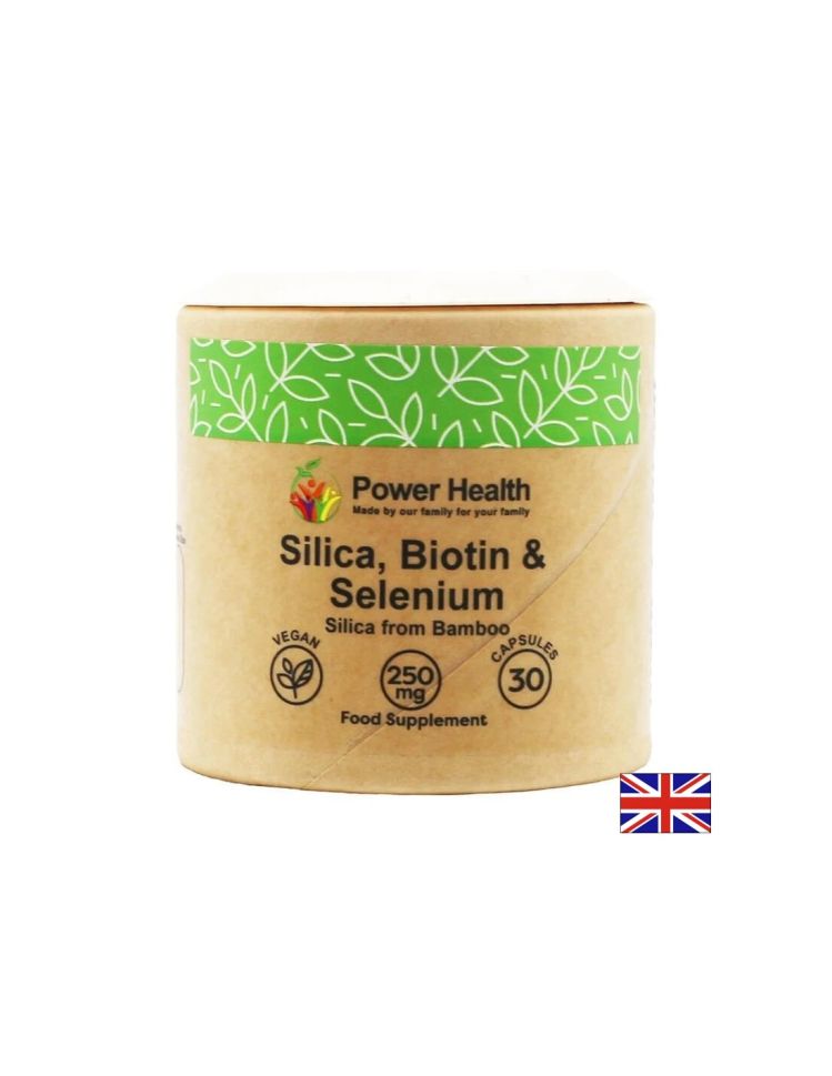 Силиций, Биотин и Селен от британския бранд Power Health е хранителна добавка предназначена да осигури хранителните вещества необходими за добро общо здраве на косата, кожата и ноктите. Тази формула съдържа ефективна доза силициев диоксид, извлечен от екстракт от бамбук, обогатен с биотин и селен. Подходяща за вегани и за вегетарианци.