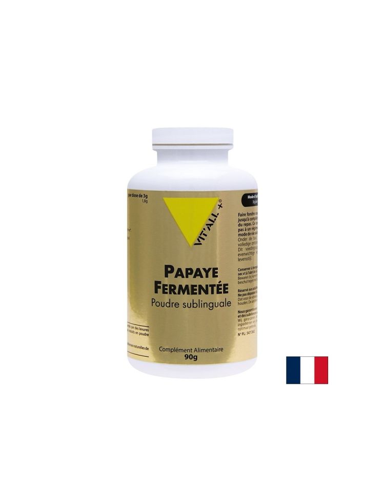 Vital Plus Papaya Fermentee се произвежда изцяло от 100% натурални съставки, като плодовете на папая се подлагат на продължителна ферментация с дрожди. Този процес на ферментация продължава няколко месеца, през които папаята преминава през трансформации, превръщайки се в лесно усвоим прах. Ферментацията позволява на хранителните вещества в папаята да станат по-биодостъпни и активни, като същевременно запазва всички естествени ензими и антиоксиданти.