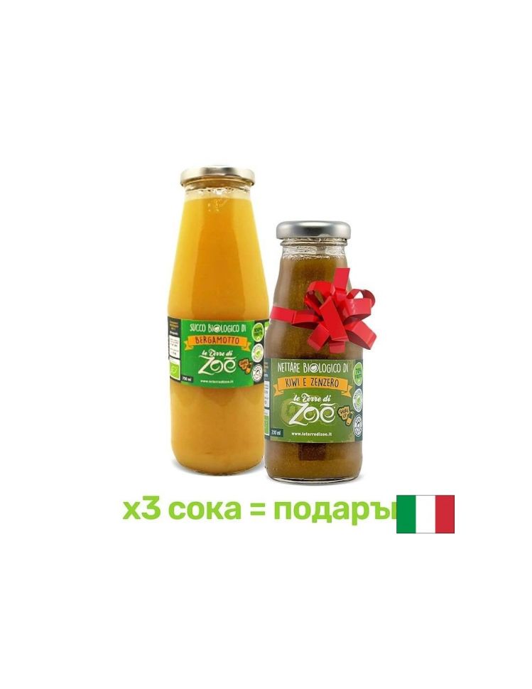 100% сок от бергамот от Калабрия. Без добавена захар и водаПри поръчка на 3бр. сок от бергамот ще получите подарък органичен нектар от киви и джинджифил 200 ml.